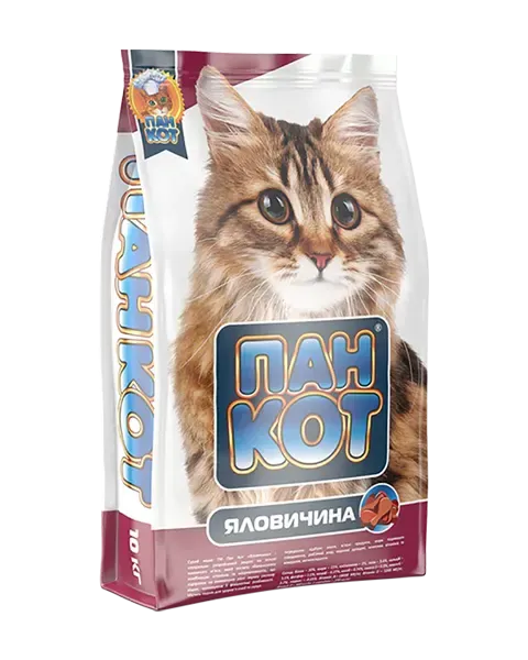 Сухий корм ТМ «Пан Кіт» “Яловичина” – спеціально розроблений рецепт на основі яловичого м’яса, який містить збалансовану комбінацію вітамінів та мікроелементів , що підтримує на належному рівні імунну систему кішки, враховуючи її фізіологічні особливості. Містить таурин для здоров’я очей та серця